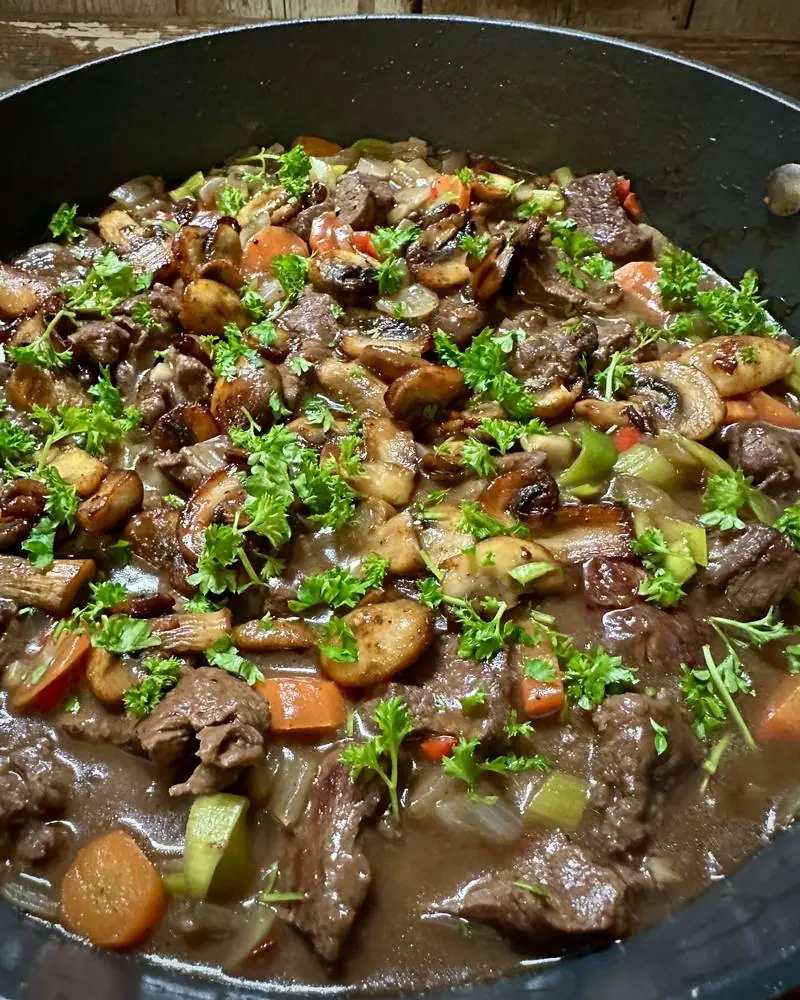 Nydelig gryte med saftig og godt biffkjøtt. Her laget med hjort - men bruk gjerne andre typer BRA biffkjøtt. Husk at en enkel gryte aldri blir bedre enn råvarene du bruker!