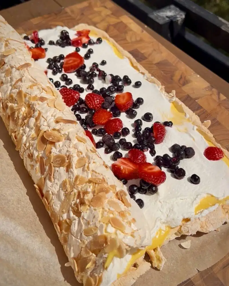 Smør først den gule eggekremen over bunnen, deretter vanlig krem. Pynt med bær og rull kaken sammen.