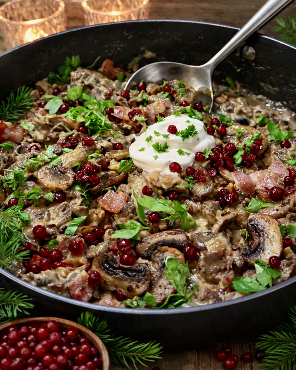 Når kjøttet er klart har du tilbake sopp, løk og bacon i panna