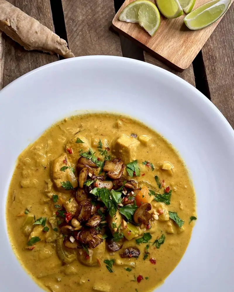 Tilsett kokosmelk,vann, Kyllingfond,fløte, hakkede tomater og hele boksen med ananas i kjelen. Kok opp og la alt småkoke 30 minutter