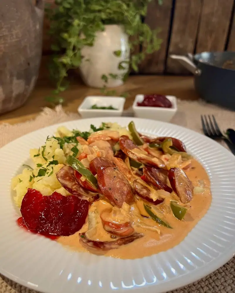 De fleste middager blir ofte til utifra hva man har i kjøl og frys. Denne pølsegryta var intet unntak!