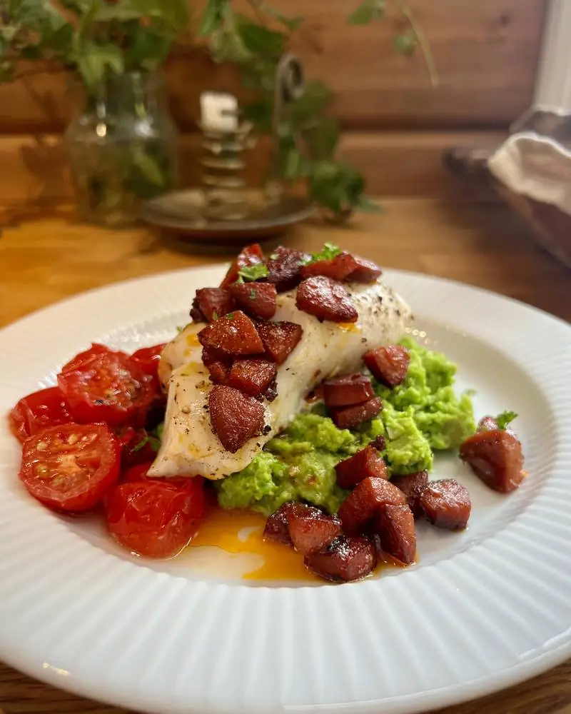 Bakt torsk, ertepuré og spicy chorizopølse på toppen.