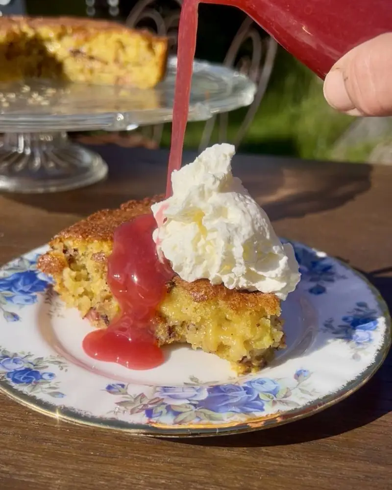 Her har jeg rett og slett brukt eplekake oppskriften og hatt rabarbra istedenfor - og jeg elsker den litt syrlige smaken i en kake.