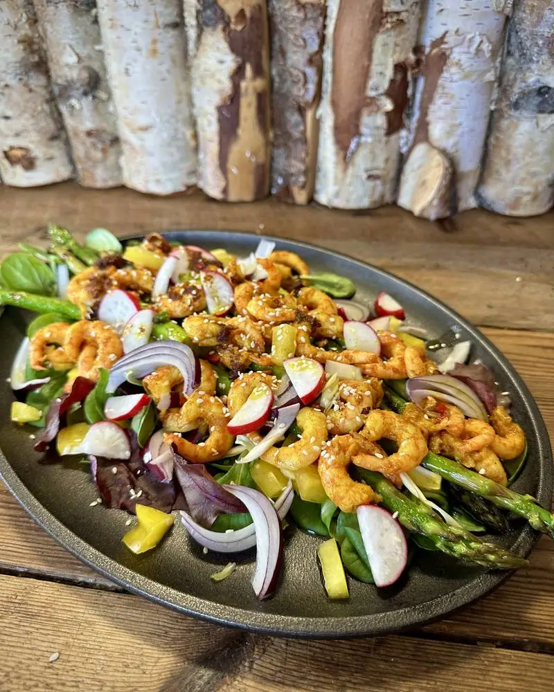 Da håper jeg denne salaten med curry stekte reker og asparges vil falle i smak! Litt spicy for deg som liker mat med litt smak.
