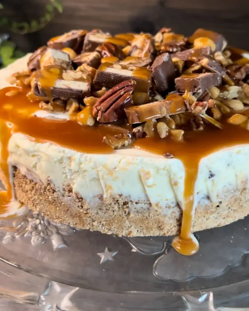 Pyntes med salt karamellsaus, biter av Snickers og nøtter